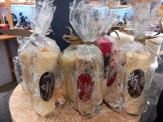 Trio of different flavour Orkney cheddar cheese in festive packaging and tag for a personal message